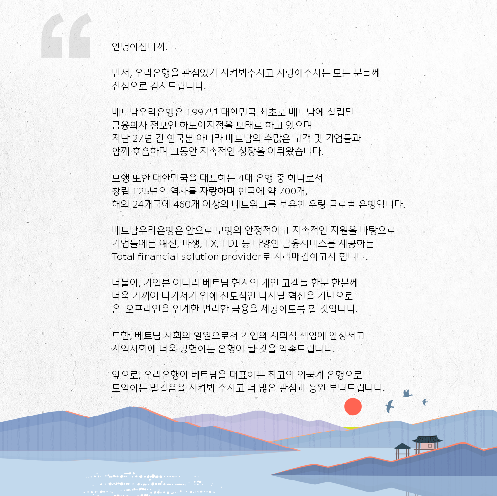 최고의 금융 서비스를 지향합니다. 베트남 고객님들의 믿음과 사랑을 바탕으로, 끊임없이 배우고 혁신하여