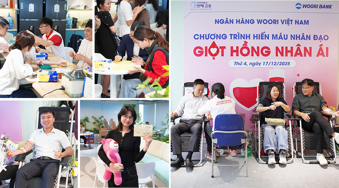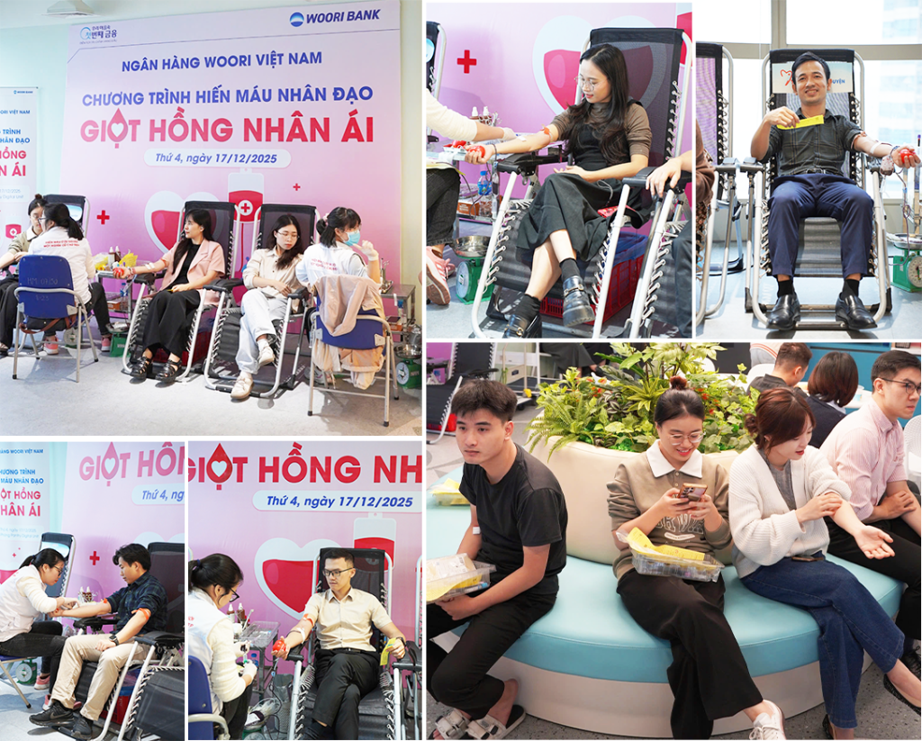 Sáng 17/12/2025 vừa qua, tại Hội sở chính, gần 100 cán bộ nhân viên Ngân hàng Woori Việt Nam từ Hội sở và các Chi nhánh/PGD tại khu vực Hà Nội đã cùng tham gia chương trình Hiến máu nhân đạo “Giọt hồng nhân ái”. Chương trình do Ngân hàng phối hợp cùng Viện Huyết học – Truyền máu Trung ương tổ chức. Kết quả, tập thể Woori Bank đã đóng góp hơn 70 đơn vị máu, những món quà vô giá đối với những người bệnh đang cần sự sống từng ngày.