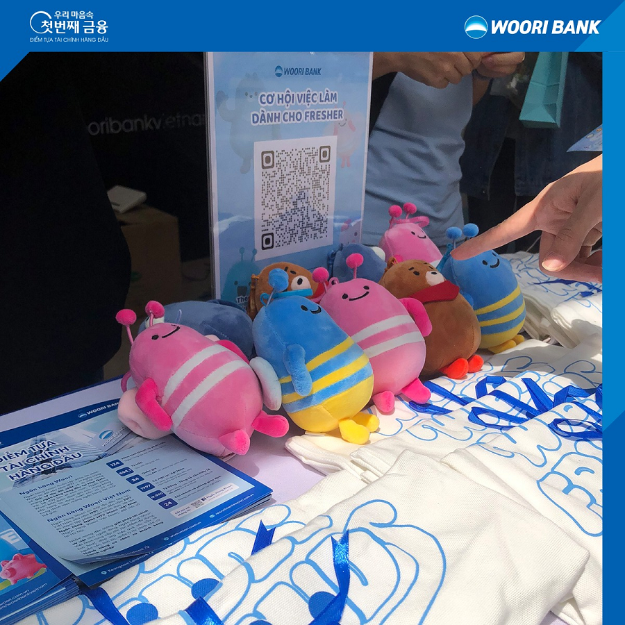 Không dừng lại ở việc giới thiệu sản phẩm “hot”, tại gian hàng của Ngân hàng Woori Việt Nam cũng diễn ra các hoạt động sôi nổi thu hút sự tham gia của đông đảo các bạn sinh viên. Các hoạt động như đăng ký mở tài khoản, chơi trò chơi đố vui, chụp ảnh check-in,… góp phần tạo không khí vui tươi, hứng khởi cho sự kiện. Đặc biệt, không phải chỉ “chơi mà vui”, Woori cũng đã chuẩn bị hàng trăm quà tặng như gấu bông Wibee Friends, gối cổ, túi tote, … với tinh thần “có quà thêm vui” để dành tặng cho các bạn sinh viên tích cực tham gia hoạt động.